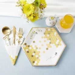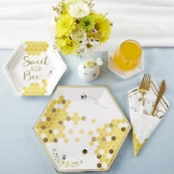 All the buzz at your party will be around your table set with these Sweet As Can Bee Lunch Plates. These hexagon-shaped plates feature gold foil borders, yellow and gold foil honeycombs with a bee, and greenery. Use these sturdy paper plates to carry all your bee-licious party foods at your bumble bee baby shower or child’s first birthday party.