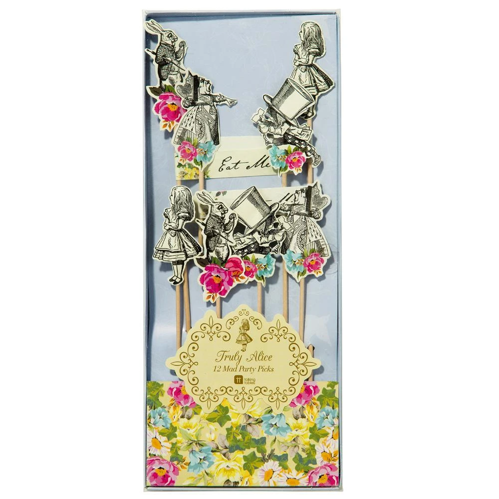 Label your treats in true mad hatter fashion with Alice in Wonderland Party Picks! These wooden food picks feature cardstock cutouts of Alice, the Mad Hatter, the Queen of Hearts, and the White Rabbit. Some picks include an additional “Eat Me” flag to catch the attention of curious guests. Each cutout is printed with original illustrations from the book and beautiful pastel floral designs. Show off your finger foods or top your child’s birthday cake with the Alice in Wonderland cake toppers. Pair these elegant tea party picks with our Alice in Wonderland collection for your child’s Alice in Wonderland birthday party.