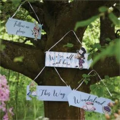 Welcome your guests to your mad hatter tea party with these Alice in Wonderland Party Sign Decorations! These paper sign arrows feature quotes from the classic children’s book and come with a ribbon for easy hanging. Decorate your outdoor tea party with these signs for an excellent addition to an Alice in Onderland first birthday party. Pair these curious signposts with our Alice in Wonderland collection, so your guests aren’t late for tea time!