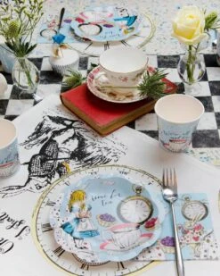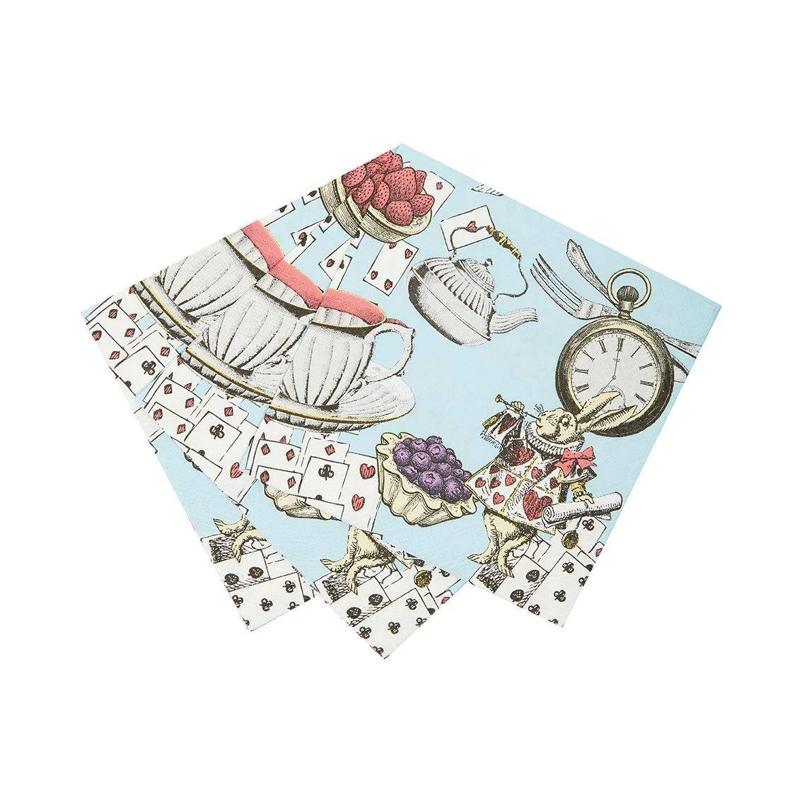 Set the table for a mad hatter tea party with these Alice in Wonderland Beverage Napkins. Each of these small paper napkins features the original book illustration of the rabbit, his watch, a teapot, and a scatter of cards on a light blue background. Set a stack of these small cocktail napkins on the drink table so guests can grab with their favorite beverage or clean up small spills. Pair these elegant napkins with the coordinating plates and cups for your child’s Alice in Wonderland birthday party.