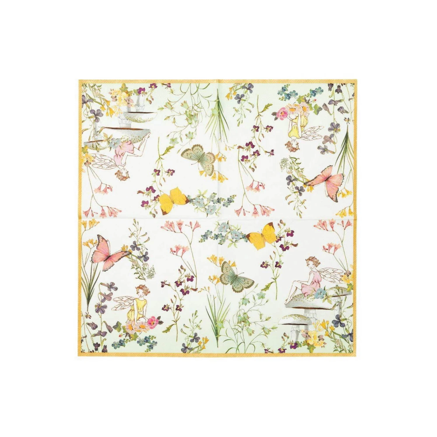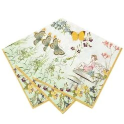 Create an adorable table setting with these quaint Floral Fairy Napkins. These large paper napkins feature a pretty setting with a friendly fairy, butterflies and delicate flowers. These eye-catching fairy princess napkins are perfect for catching crumbs or cleaning up messy spills at your child’s fairy princess party! Each pack contains 20 paper napkins. Coordinate these paper napkins with our Fairy collection for an enchanting fairytale birthday party!