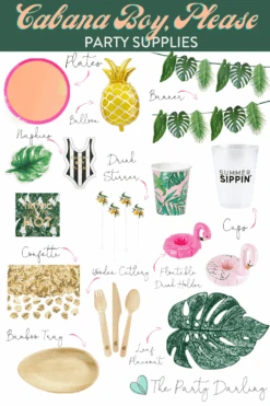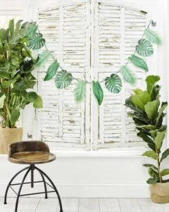 Bring the tropics to your summer party by decorating with a Tropical Palm Leaf Garland! The paper banner features photographic images of various palm leaves cutout and strung on a green ribbon. Use this luscious palm garland to decorate the wall, the stair railing, or anywhere else in the house for your tropical bridal shower or little one’s jungle birthday party!
