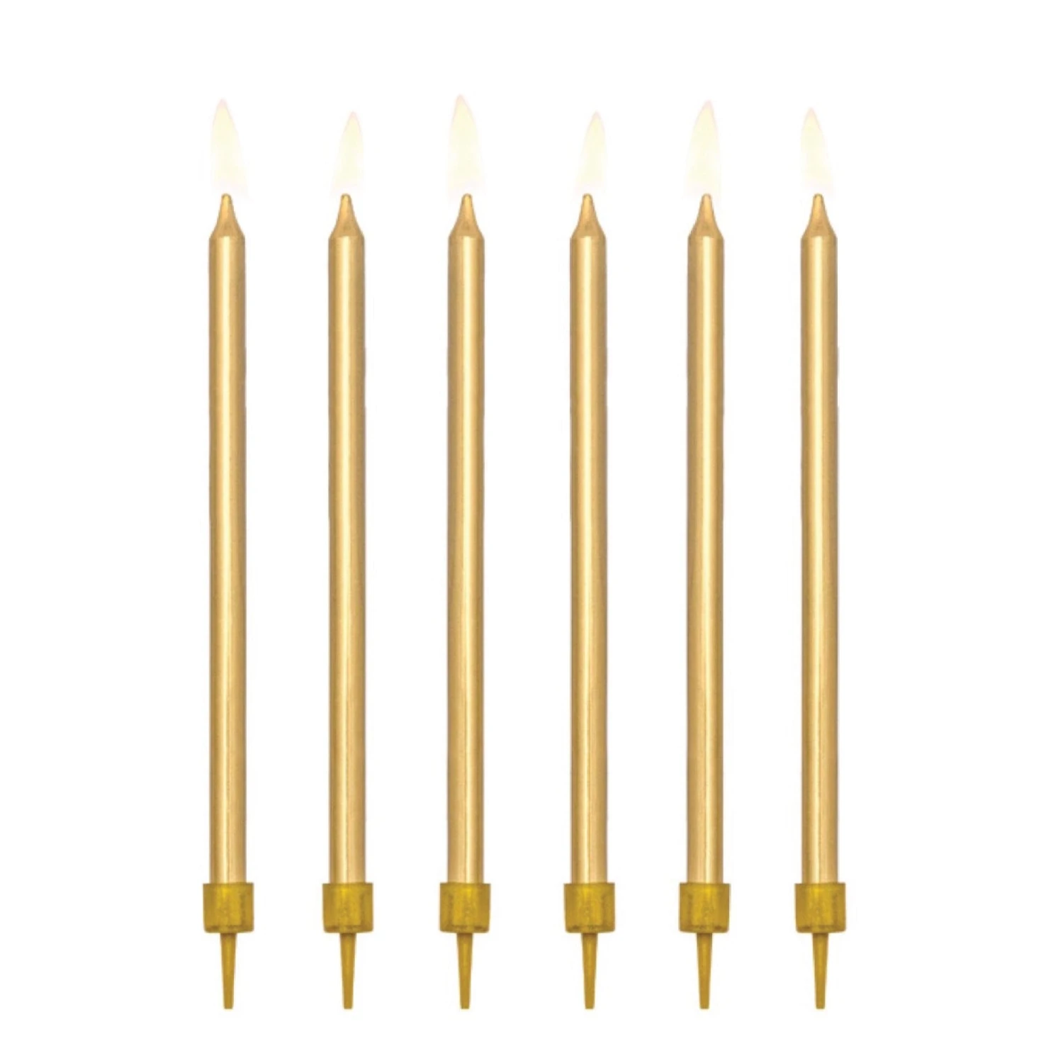 Create a dramatic statement when you decorate the cake with these Tall Gold Birthday Candles. These gold party candles are 5in tall and make a big statement on top of your birthday cake. The metallic gold color adds a touch of elegance to your display and makes them a great addition to your anniversary cake. Add enough gold candles to match the guest of honor’s age or use them with other candles for a unique birthday cake display. Place these tall birthday candles in birthday cakes, cupcakes, cookies, or any other delicious desserts!