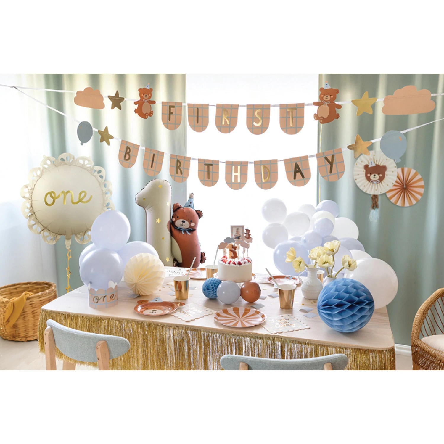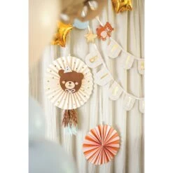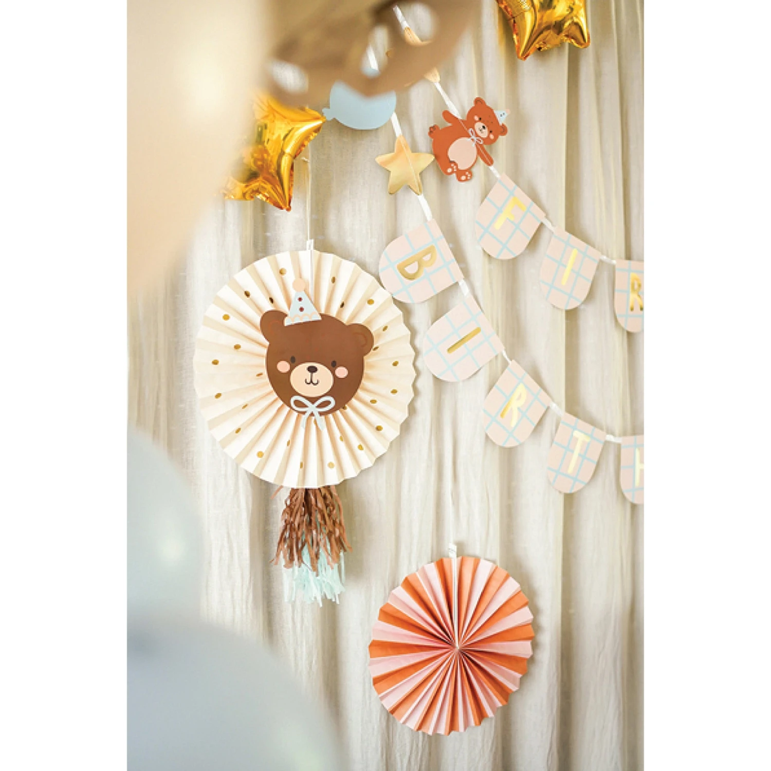 Make your party bear-y fun with these Teddy Bear Party Paper Fan Decorations! These adorable paper fans come in two different designs, one featuring gold dots on a cream background and a bear with a party hat to stick to it along with brown and blue tassels hanging below, the other is brown and pink striped. Easily assemble these fans and hang them from the ceiling with the included string, or display them on a wall for a bear party backdrop. Perfect for adding a touch of adorable fun to a 1st birthday party, these decorations will have everyone feeling like your party is bear-y special.Â