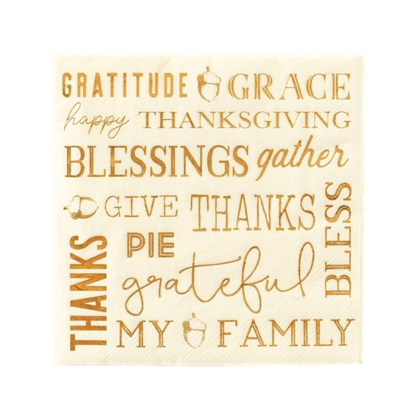 Keep fall treats in your belly and off your face with these Thanksgiving Words Lunch Napkins! These large napkins are great for wiping up spills and holding appetizers or desserts at your Friendsgiving or Thanksgiving dinner. They feature copper foil wording like “Happy Thanksgiving,” “Give Thanks,” and “Grateful,” and many more on a beige background. Finish your table setting with these napkins for a beautiful fall harvest spread!Â