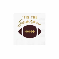 Tailgate in style with these ‘Tis the Season Football Dessert Napkins. These cocktail napkins feature a brown football with gold foil stitches and the words ‘Tis the Season. Use these small football napkins at your game-watching party, birthday party, or baby shower. Pair these napkins with other football tableware and decorations for a fun tailgate baby shower or super bowl watch party.Â