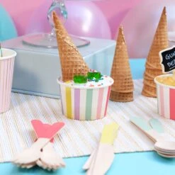 Serve delicious food with Tricolor Wooden Cutlery Set. This wooden flatware set comes with three different colors on the handle: red, mint green, and yellow. This assortment of wooden silverware has forks, knives, and spoons. Pair these with any of our sweet treats, candy, or ice cream party collections.