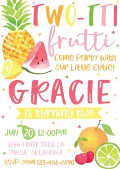 Invite your guests to your child’s 2nd birthday party with this Twotti Frutti Birthday Party Invitation. Featuring fun citrus colors with watermelons, lemons, oranges, limes, cherries, and pineapples, this double-sided party invitation will get your guests ready for some refreshing fruits. This personalized party invitation is perfect for your little girl’s tutti frutti birthday party. This listing is for a personalized digital invitation that is print-ready. It’s easy to customize your message. If you would like to request different colors, please contact us for a custom order. With our fast production schedule, we will have these in no time!