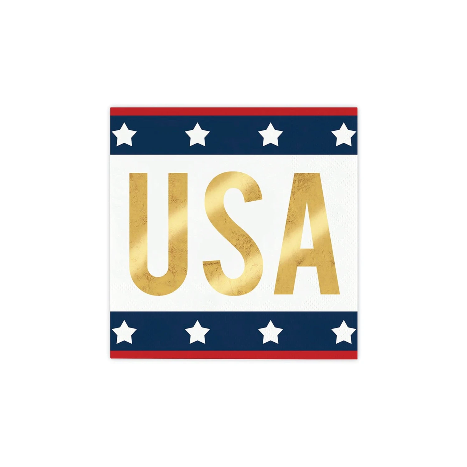 Add a touch of patriotic flair to your dessert table with our USA Gold Foil Dessert Napkins. These small paper napkins feature “USA” in bold gold foil print on a white background with a classic red and blue border with white stars. Keep a stack of these patriotic napkins on the table so guests can clean up small spills or use them as a drink coaster at your USA party celebration! Pair these napkins with other red, white, and blue tableware to light up your 4th of July summer BBQ. Whether you are celebrating Memorial Day, Labor Day, or hosting an Olympics watch party, these USA napkins are a festive addition to your party! Pair these napkins with our other patriotic party supplies.