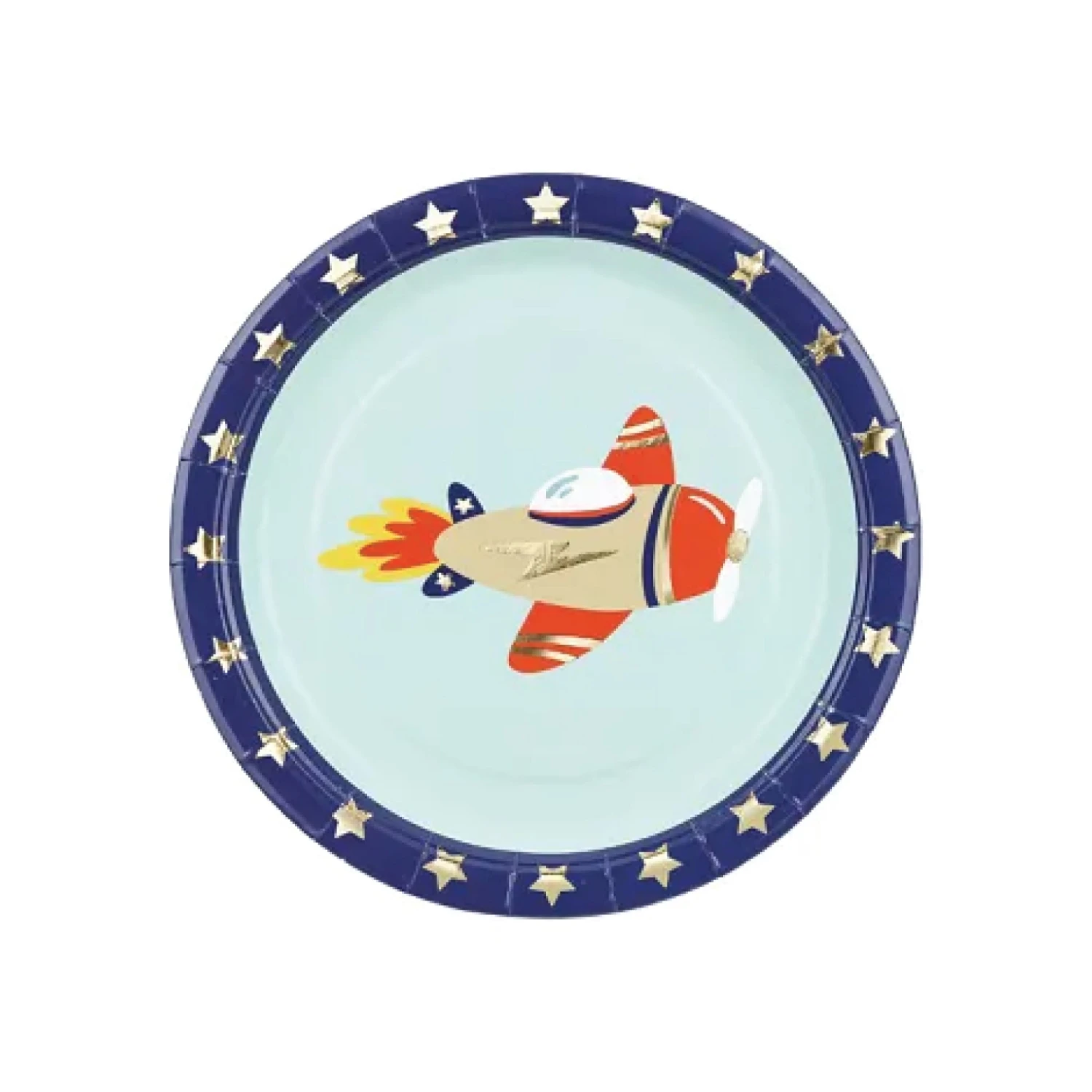 Prepare for a sweet journey through the skies with Vintage Airplane Dessert Plates! These small paper plates showcase a vintage airplane with gold foil detailing against a light blue background, framed by a dark blue border adorned with gold foil stars. Perfect for serving treats and desserts to little pilots or aspiring aviators, these disposable plates turn every bite into a high-flying adventure. Whether hosting a how time flies airplane birthday party or an up up and away airplane baby shower, let these airplane plates make your celebration soar to new heights.