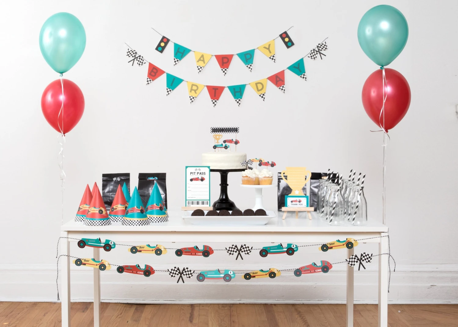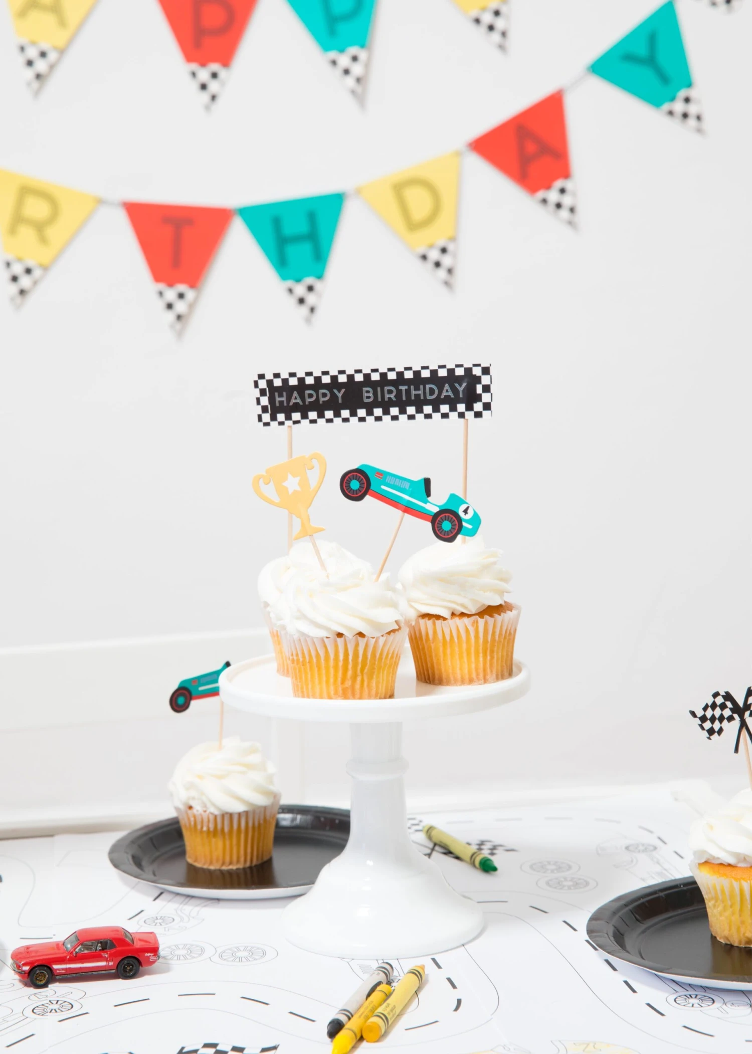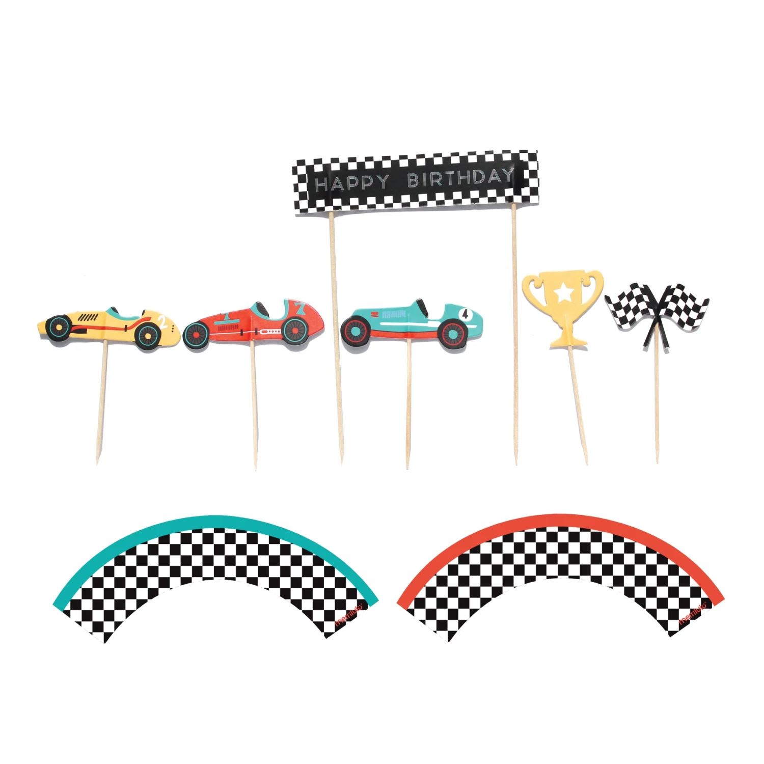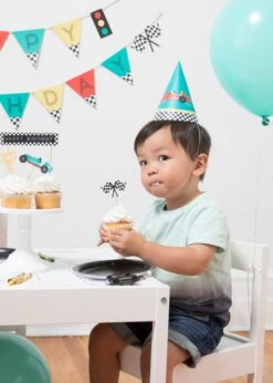 Guests will want to make a pit stop at the dessert table when you use these Vintage Race Car Cupcake Toppers & Wrappers! This cupcake decorating kit includes checkered black and white wrappers and cupcake toppers with cutouts of vintage race cars, trophies, checkered flags, and one large topper that reads “Happy Birthday.” With enough pieces to decorate a dozen treats, use these race car wrappers and toppers to transform the dessert table into a race track for your child’s Two Fast Two Curious birthday party.