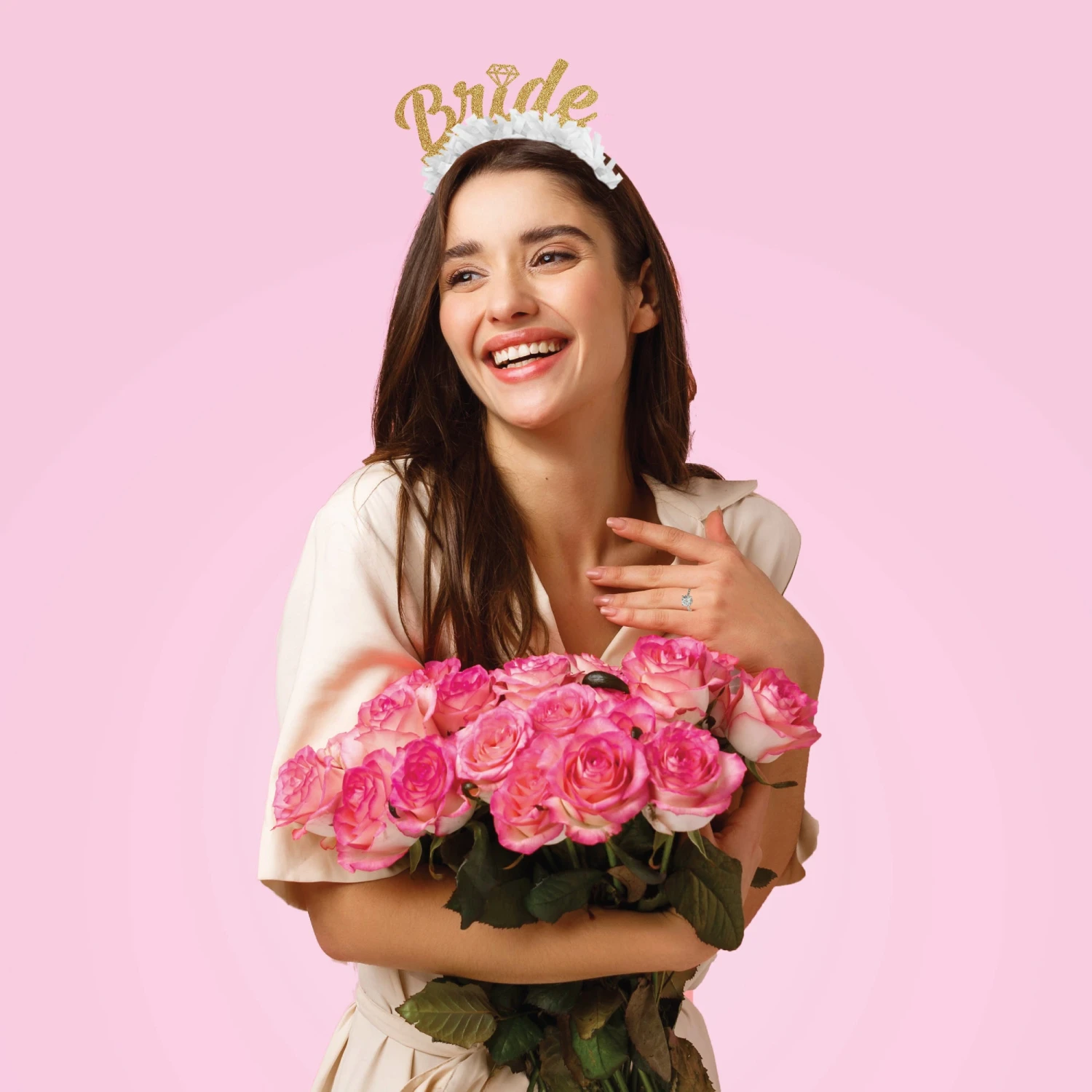You’ll look stunning when you wear this White & Gold Bride Headband at your bridal shower. This fun hair accessory reads “Bride” in glittery gold script letters across the top and white tissue fringe on a black plastic headband. This trendy party crown makes a great photo prop and party favor to the bride-to-be. Gift this cute bridal accessory and have the future Mrs. wear the bride headband for a bachelorette party or a bridal shower gathering. Match with other white and gold bachelorette party supplies for a picture-perfect party look.