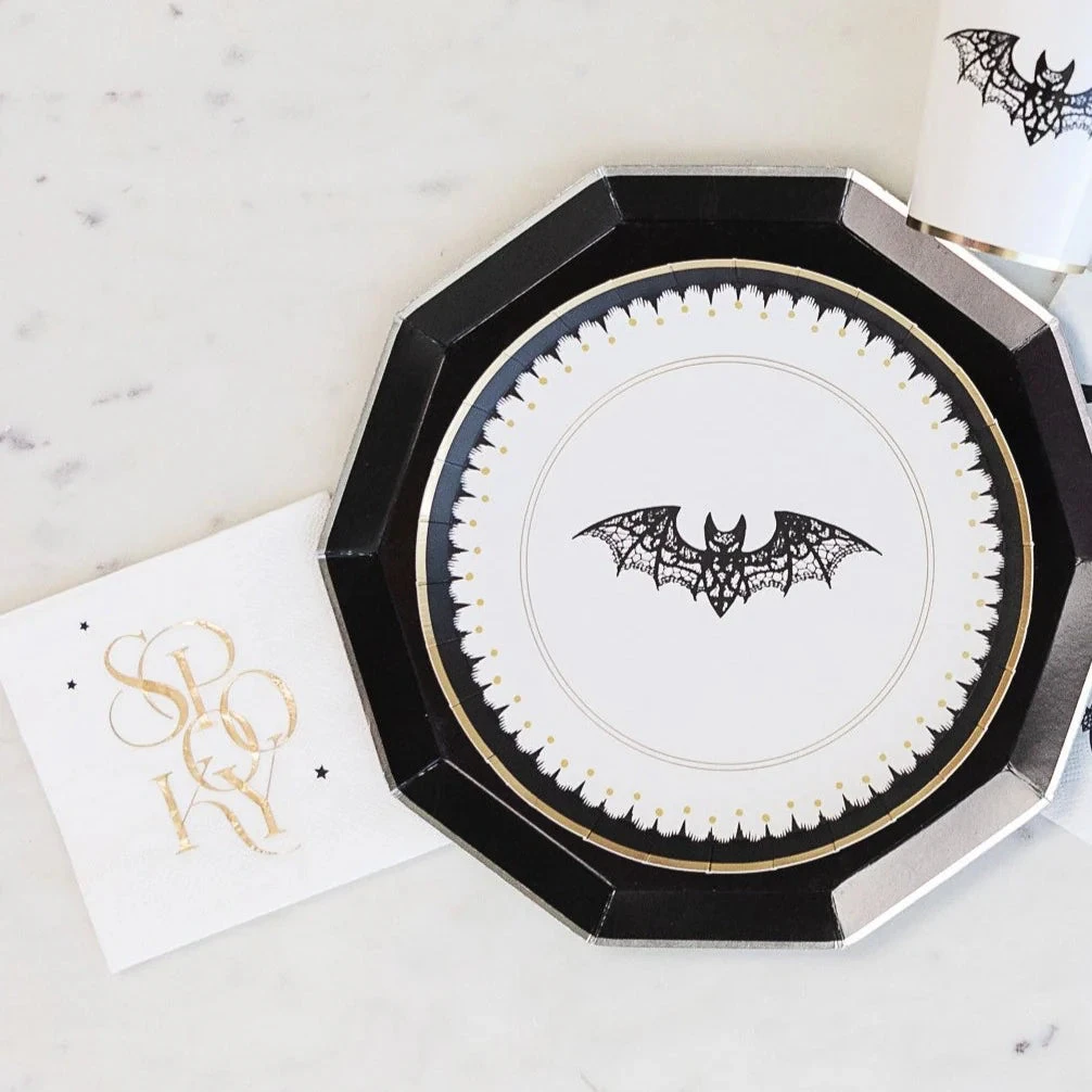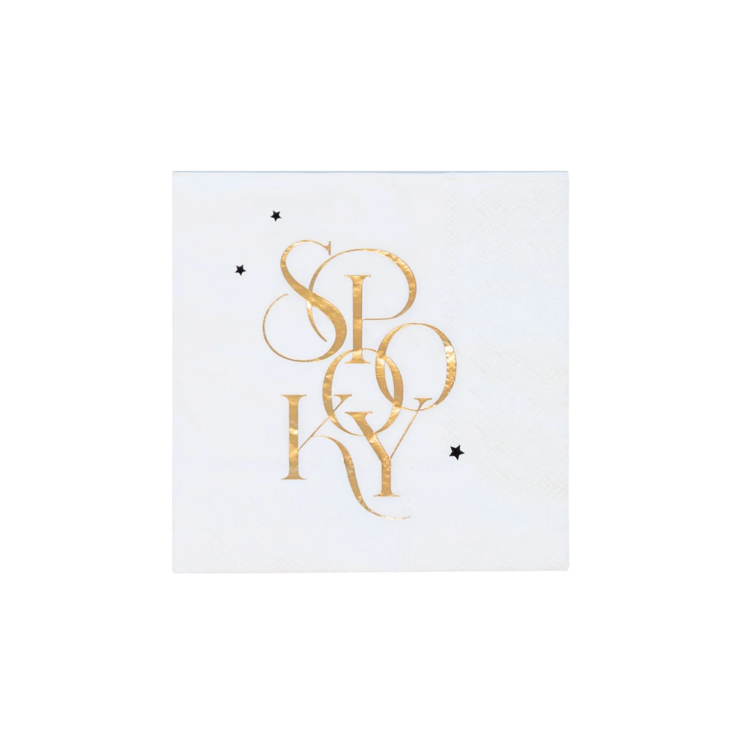 Glam up your ghoul fest with these White & Gold Spooky Dessert Napkins! These small paper napkins feature tiny black stars and a gold foil “spooky” headline on a white background. Perfect for displaying on your Halloween bar cart, they can also be used to wipe up crumbs or as chic coasters for your best witches brew. Use these Halloween napkins to make your Halloween party truly spooktacular!