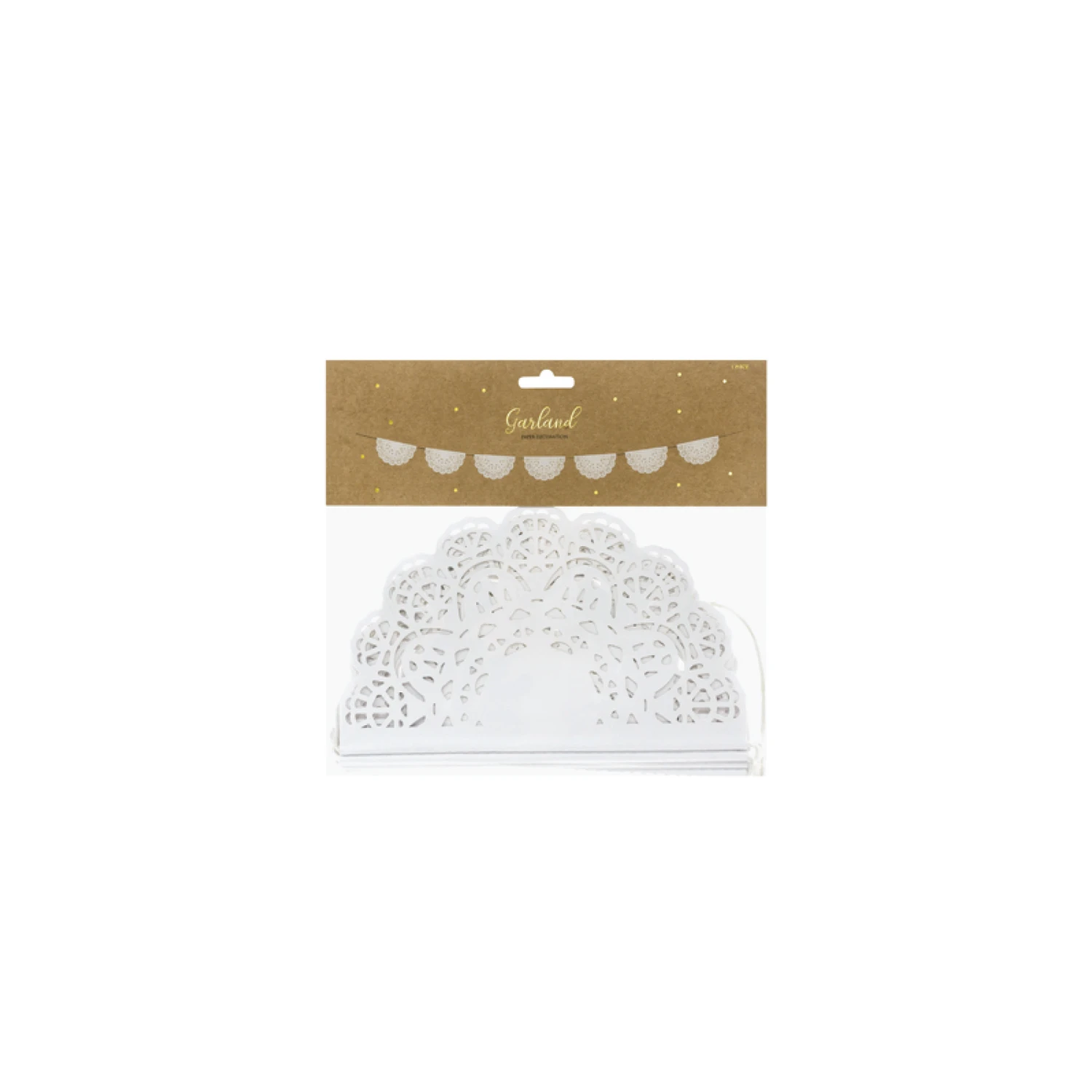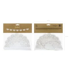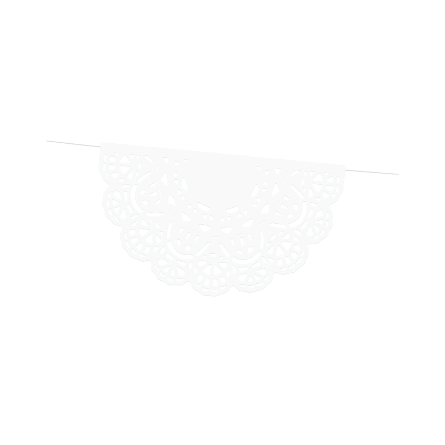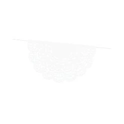 Add an elegant lace look to your rustic wedding with this White Paper Doily Lace Garland! This paper garland features white paper doilies attached to a white string. Hang this lace banner on the front of the snack table, front porch, or a photo booth backdrop at your wedding or bridal shower. Add a decorative touch with this lace bunting to your tea party birthday decorations.