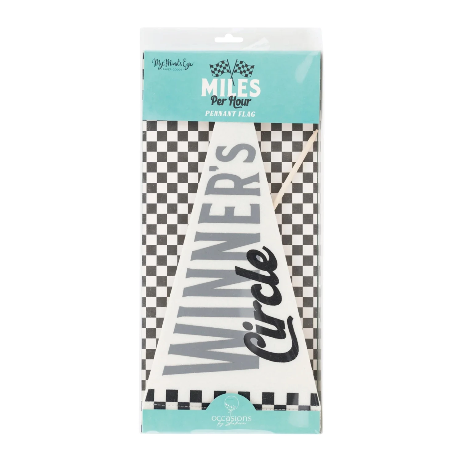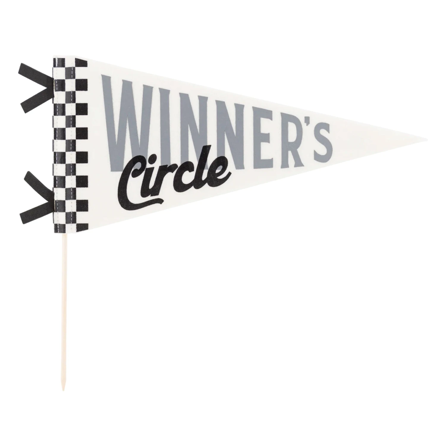 Wave this Winner’s Circle Felt Pennant Flag when your little one crosses the finish line! This striking pennant features a gray and black “Winner’s Circle” headline on a white felt flag with a black and white checkered flag edge. Slip it on the included wooden dowel for easy display. Whether you’re using it as a cake topper or gifting it as a party favor to the birthday champ, this racing party decoration calls for a victory lamp. Perfect for celebrating a fast one birthday, a two-fast birthday, or any racing party where victory is on the horizon, hang this pennant proudly as a centerpiece or grab it for fun photo booth props.