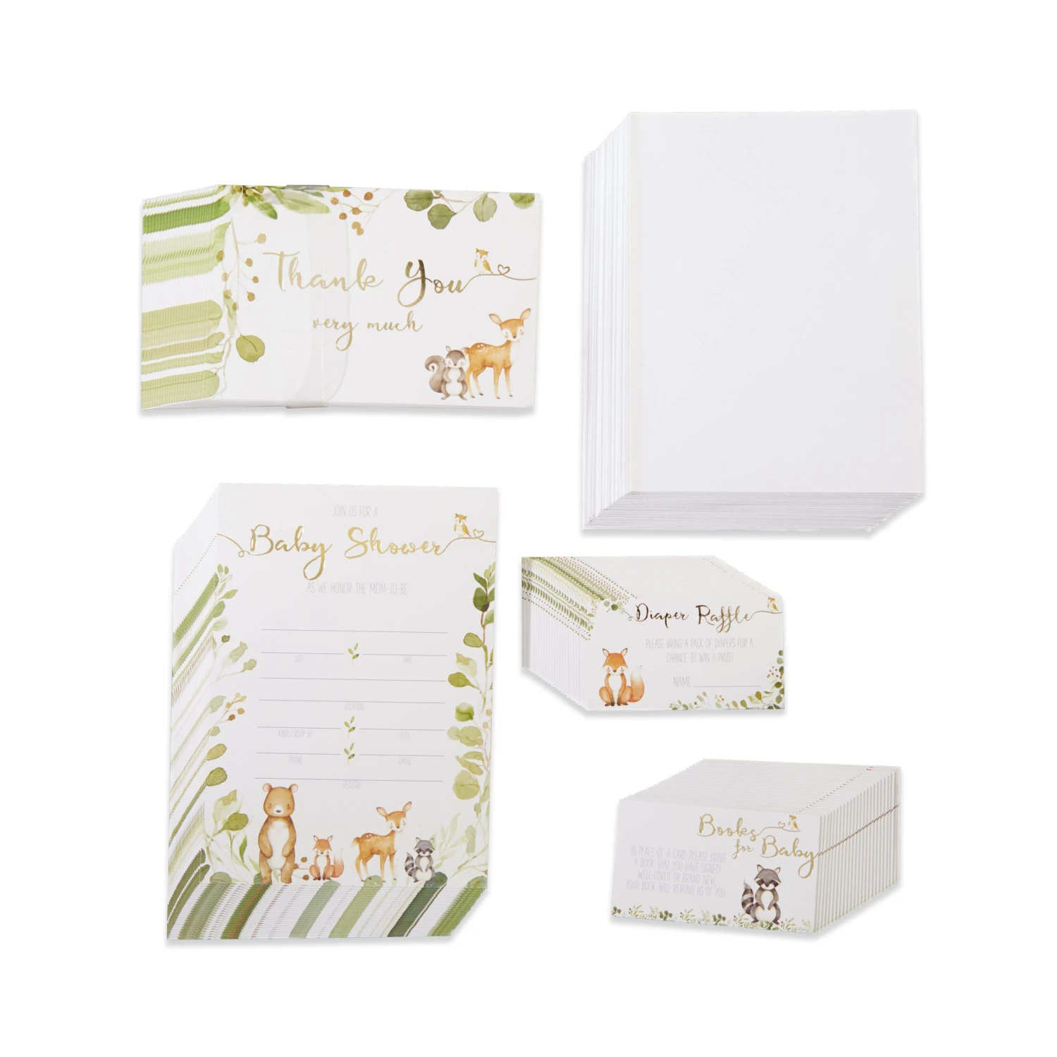 Invite guests to celebrate the new bundle of joy with Woodland Baby Shower Invitation & Thank You Card Bundle. The Woodland Baby invitation bundle includes 25 thank you postcards, 25 white envelopes, 25 invitations, 25 books for baby cards, and 25 diaper raffle cards. Featuring a border of greenery, forest animals around the bottom half, and gold foil lettering, these baby shower invitations and cards are perfect to use for your woodland baby shower. Pre-printed lines on the invitations make it easier for you to write down all the party details. A complete set of baby shower stationery helps the mother-to-be have everything in one place and complements each other, making the guest experience the theme from the moment they open the invitation. Fill in your baby shower party details, attach the diaper raffle and books for baby cards, and send them off in the included white envelopes!