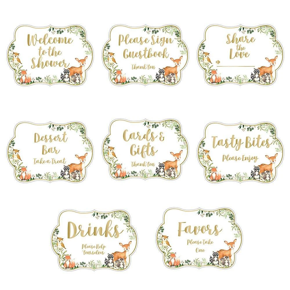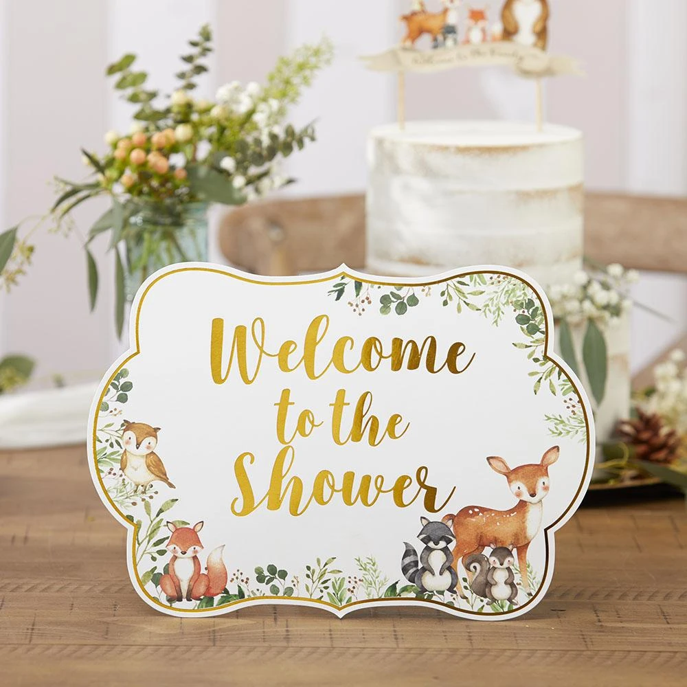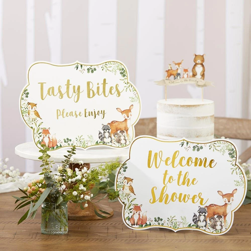 Label the tables at your baby shower with this Woodland Baby Shower Sign Kit. These party signs have a white background with a border of greenery and forest animals around the bottom half with gold foil lettering. This assortment of table signs are pre-printed with various themes including a welcome sign that reads “Welcome to the Shower” and a favor sign that reads “Favors, Please Take One.” Each sign includes a collapsible kickstand on the back allowing for easy breakdown, cleanup, and storage. Help decorate and guide your guest through your woodland baby shower or gender reveal party with this table sign kit.