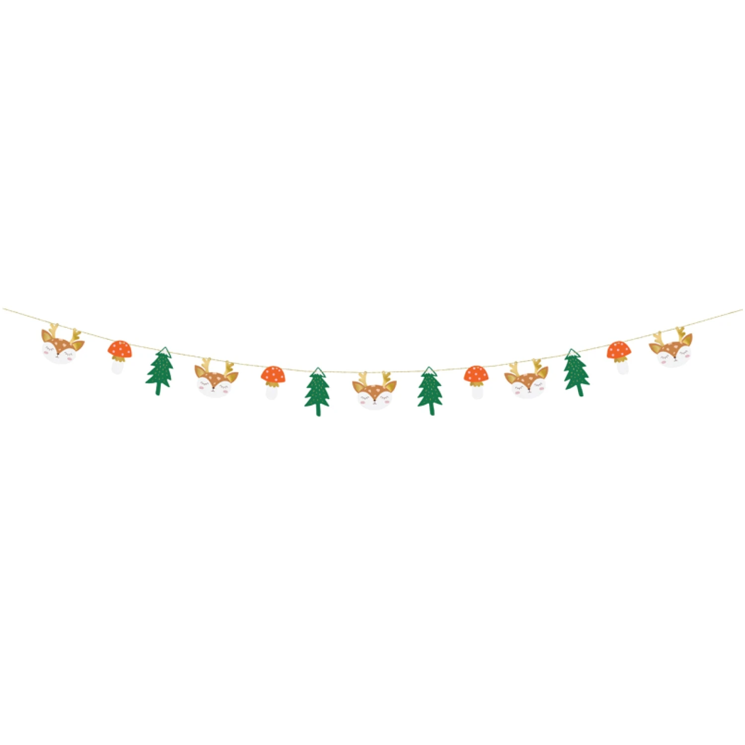 Your woodland baby shower will look charming with a Woodland Forest Animals Paper Garland. This adorable banner features reindeer, mushrooms, and festive Christmas tree attachments. Assemble these cute forest attachments along the included gold string. Hang this cute Christmas garland along the mantle, across the table, or in your photo booth backdrop at your child’s woodland birthday party or Christmas party.