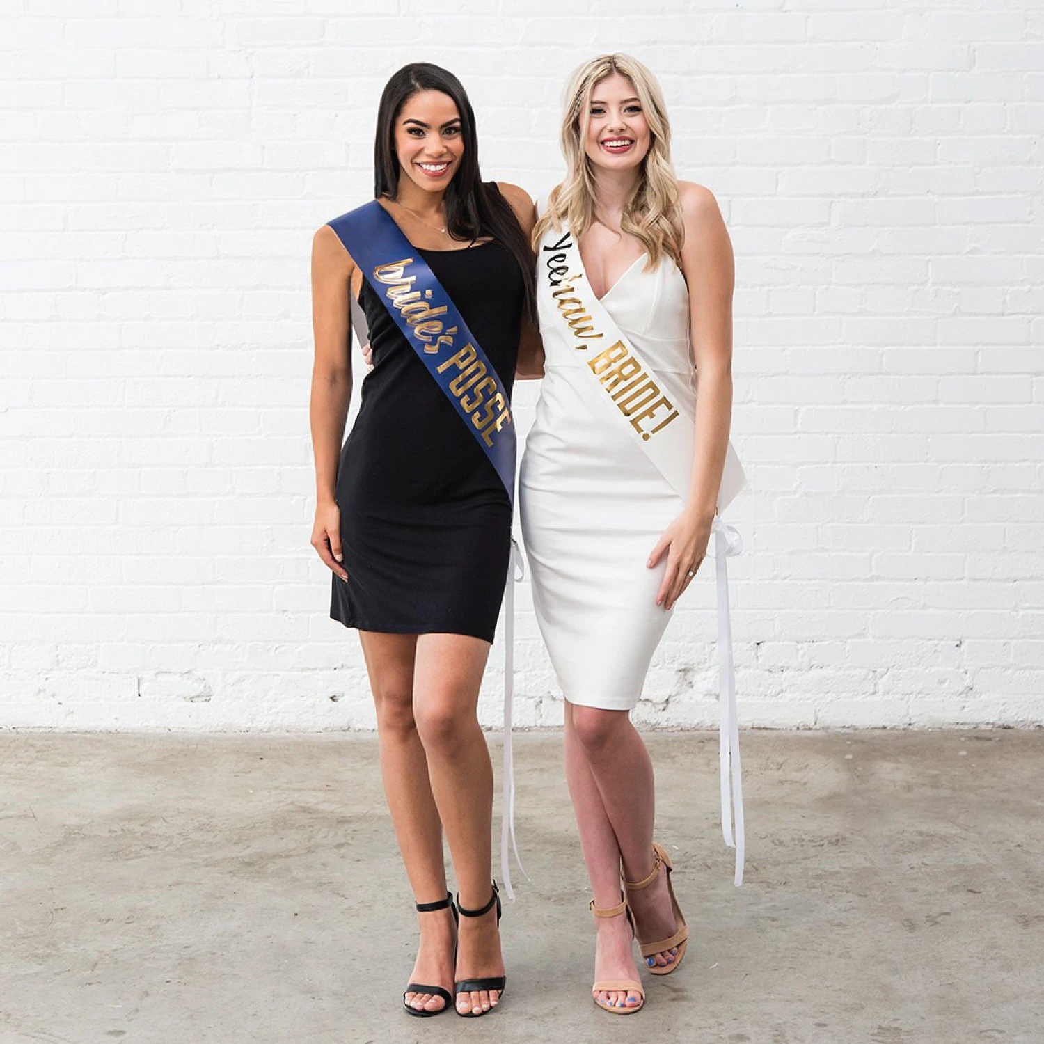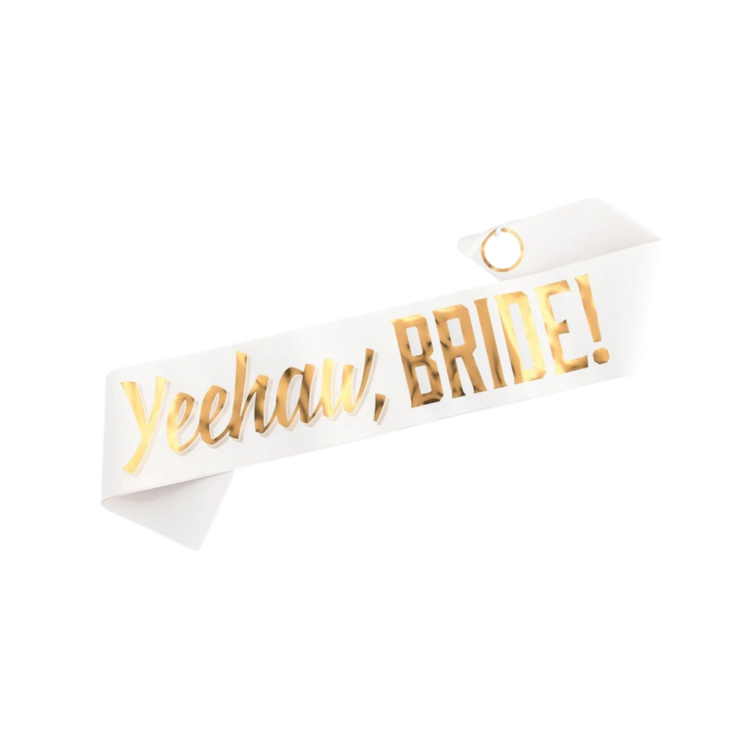 Dress up the bride to be at her nash bash with a Yeehaw Bride Bachelorette Party Sash! This paper sash features gorgeous gold script text, “Yeehaw, Bride!” on a white background. Use the white satin ribbon to tie the sash together for an adjustable fit. Inexpensive without looking cheap, the one size fits all cowgirl bachelorette party sash is a classy, easy way to celebrate the bride’s last ride. Gift this bachelorette sash to the Future Mrs. for her last rodeo with her boots, booze, and besties.